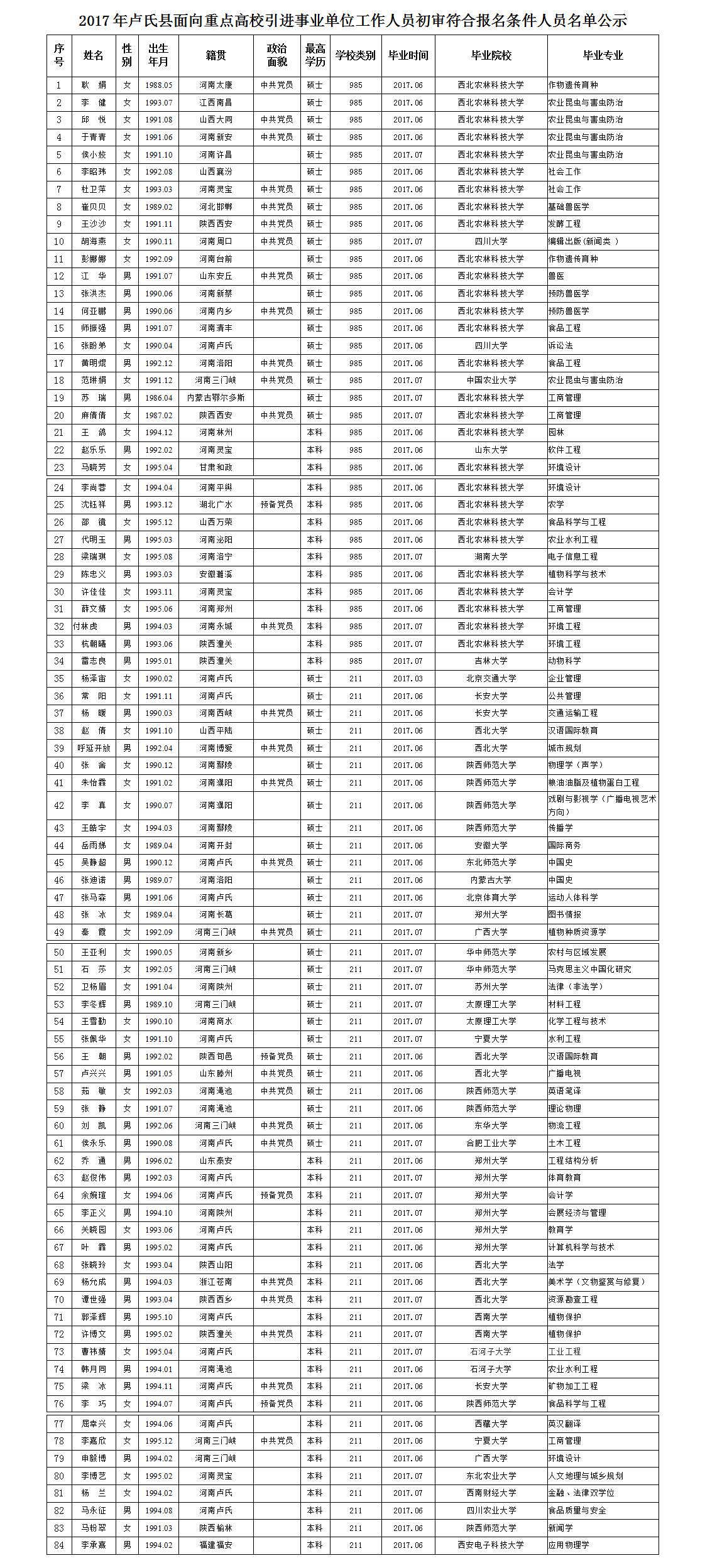 根据《卢氏县专项人才引进实施办法(试行)》和《卢氏县2017年面向重点高校引进事业单位急需短缺人才方案》,经宣传推介、组织报名、资格审查,初步符合报名条件人员83人,现将资格初审通过人员名单予以公示,如有疑误,请及时与县人才引进工作领导小组办公室联系。本次人才引进工作,资格审查将贯穿于整个引进过程,如发现弄虚作假者,将随时取消资格。