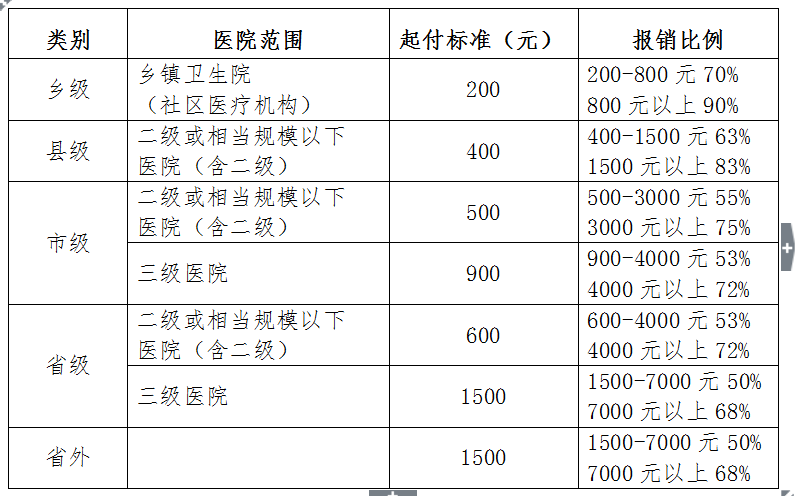 答:我省建立了城乡居民大病保险制度,如果城乡居民患大病花费高额医疗费用,在基本医保报销后还可以享受城乡居民大病保险待遇,自己负担符合规定的住院费用超过1.5万元以上,按下述标准再给予报销。大病保险资金从各地城乡居民基本医疗保险基金中划拨,参保居民个人不再缴费。其中:1.5万元—5万元(含5万元)部分报销50%;5万元—10万元(含10万元)部分报销60%;10万元以上部分报销70%;一年最高可报销40万元。